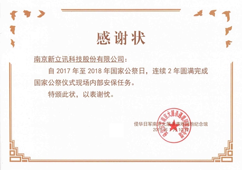 近日,南京新立訊科技股份有限公司收到侵華日軍南京大屠殺遇難同胞紀(jì)念館感謝狀,對新立訊在2017至2018連續(xù)兩年圓滿完成國家公祭儀式現(xiàn)場內(nèi)部安保任務(wù)表示感謝。