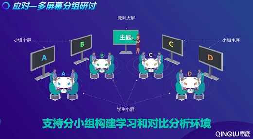 在多屏研討的教學(xué)場景下,教師通過課堂分組,實(shí)現(xiàn)學(xué)生-小組-課堂之間的實(shí)時(shí)互動,讓每個(gè)小組成員自由分享學(xué)習(xí)成果,構(gòu)建小組探究、自主學(xué)習(xí)的智慧學(xué)習(xí)環(huán)境。