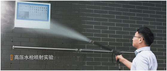 希沃云班牌按照校園環境和防塵防水標準,采用全封閉和高強度合金邊框設計。經測試,使用高壓水槍進行持續噴射,班牌依舊完好無損。