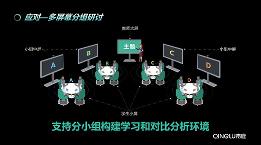 在多屏研討的教學場景下,教師通過課堂分組,實現學生-小組-課堂之間的實時互動,讓每個小組成員自由分享學習成果,構建小組探究、自主學習的智慧學習環境。