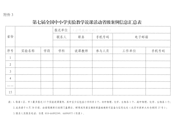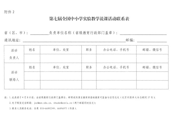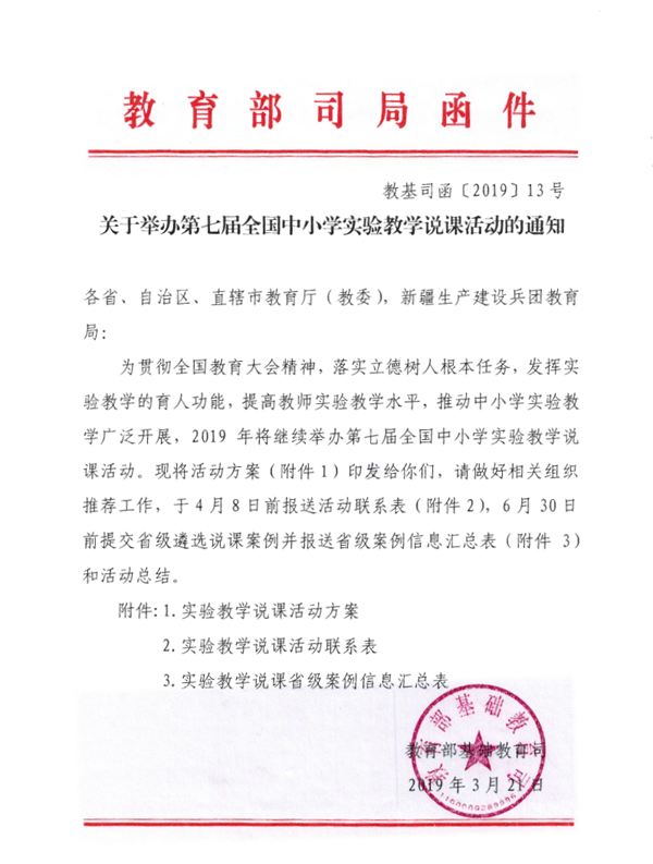 為貫徹全囯教育大會精神,落實立德樹人根本任務,發揮實驗教學的育人功能,提高教師實驗教學水平,推動中小學實驗教學廣泛開展,2019年將繼續舉辦第七屆全國中小學實驗教學說課活動。現將活動方案(附件1)印發給你們,請做好相關組織推薦工作,于4月8日前報送活動聯系表(附件2),6月30日前提交省級遴選說課案例并報送省級案例信息匯總表(附件3)和活動總結。