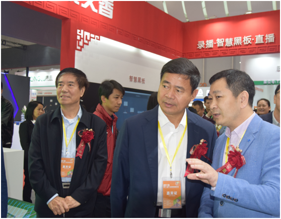 開幕式結(jié)束后,中國教育裝備行業(yè)協(xié)會會長王富,廣東省教育廳副巡視員邱克楠,廣東省教育裝備中心主任彭紅光等領(lǐng)導(dǎo),在廣東省教育裝備行業(yè)協(xié)會會長陳學(xué)機的陪同下前往參展企業(yè)展臺參觀,并與企業(yè)負責(zé)人進行了親切交流,對他們展出的新產(chǎn)品和新技術(shù)表示了認可和肯定。