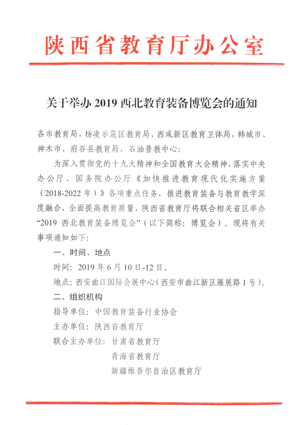 為深入貫徹黨的十九大精神和全國教育大會精神,落實中央辦公廳、國務(wù)院辦公廳《加快推進教育現(xiàn)代化實施方案(2018-2022年)》各項重點任務(wù),推進教育裝備與教育教學(xué)深度融合,全面提高教育質(zhì)量,陜西省教育廳將聯(lián)合相關(guān)省區(qū)舉辦“2019西北教育裝備博覽會”(以下簡稱:博覽會)。現(xiàn)將有關(guān)事項通知如下: