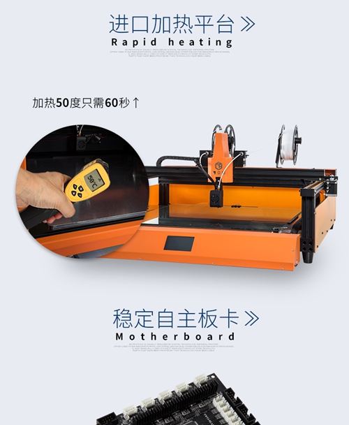 值得一提的是,T5發(fā)光字3D打印機針對發(fā)光字做了獨特的技術(shù)升級,熱床玻璃為特殊工藝玻璃完全不用擔(dān)心平臺不平問題,僅需90秒即可加熱至50度,打印大字不翹邊。并采用擠出為兩進(jìn)一出的設(shè)計,有效的解決了雙噴頭左右上下不匹配的問題,特有的泰坦擠出平使用大扭矩電機,保持?jǐn)D出料的穩(wěn)定性。該設(shè)備還配置了全彩觸屏、近程送料、斷電續(xù)打等特色功能,使得整臺設(shè)備具有操作便捷、打印速度快、打印效果好等諸多優(yōu)點。