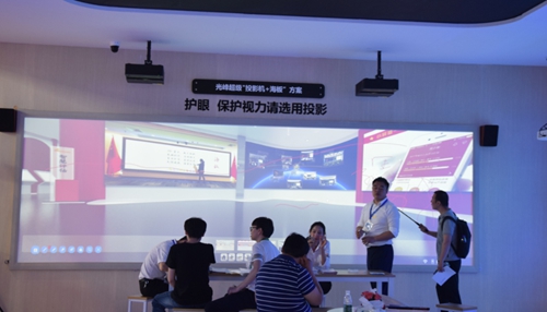 光峰高清超短焦投影方案:光峰激光高清教育擁有1080P的分辨率,超短焦投影,小的安距離投射大畫面。傳統(tǒng)的綠幕黑板+智能一體機(jī)搭配使用,符合當(dāng)前老師授課的教學(xué)習(xí)慣,又滿足了學(xué)校對(duì)高清、大畫面、長壽命的需求。