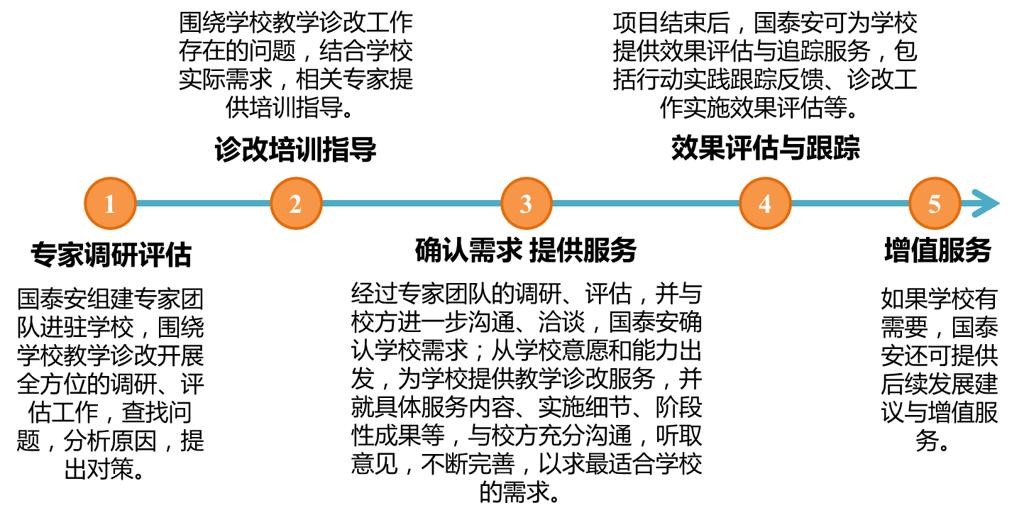 圍繞教學診改,國泰安組建由診改專家、專業研究人員、專業技術人員組成的專門項目團隊,以學校實際需求為導向,整體規劃相關產品開發和服務內容,按照專家調研評估—診改培訓指導—確認需求、提供服務—效果評估與跟蹤—增值服務等步驟,分步推進,有序開展,不斷改進。