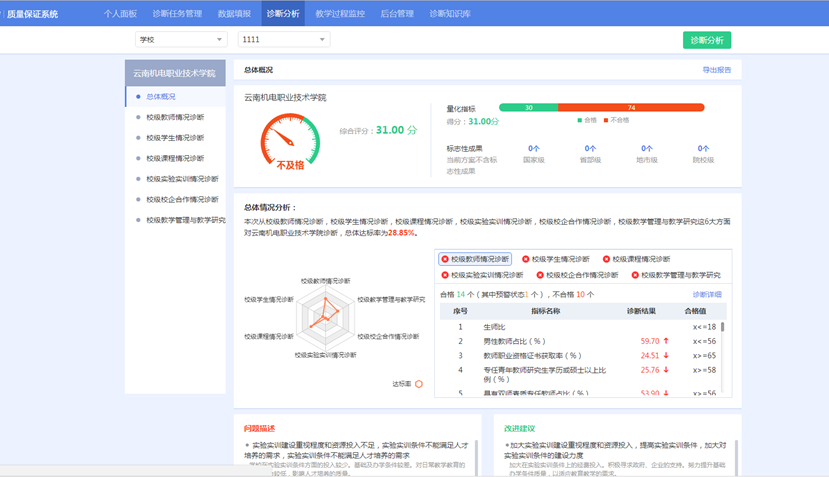 云南機電職業技術學院:根據學校教育教學實際情況,梳理5套指標庫,共計261個指標,以滿足學校質量診斷的需求;在學校現有的信息化基礎上,建設校本數據中心和質量保證系統,實現學校各項業務數據的互聯互通,實時診斷學校質量狀態,及時發現質量問題。