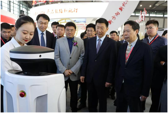 陜西“一帶一路”科技創新創業博覽會中,陜西省副省長趙剛參觀科大訊飛展區,體驗訊飛政務機器人“小途”