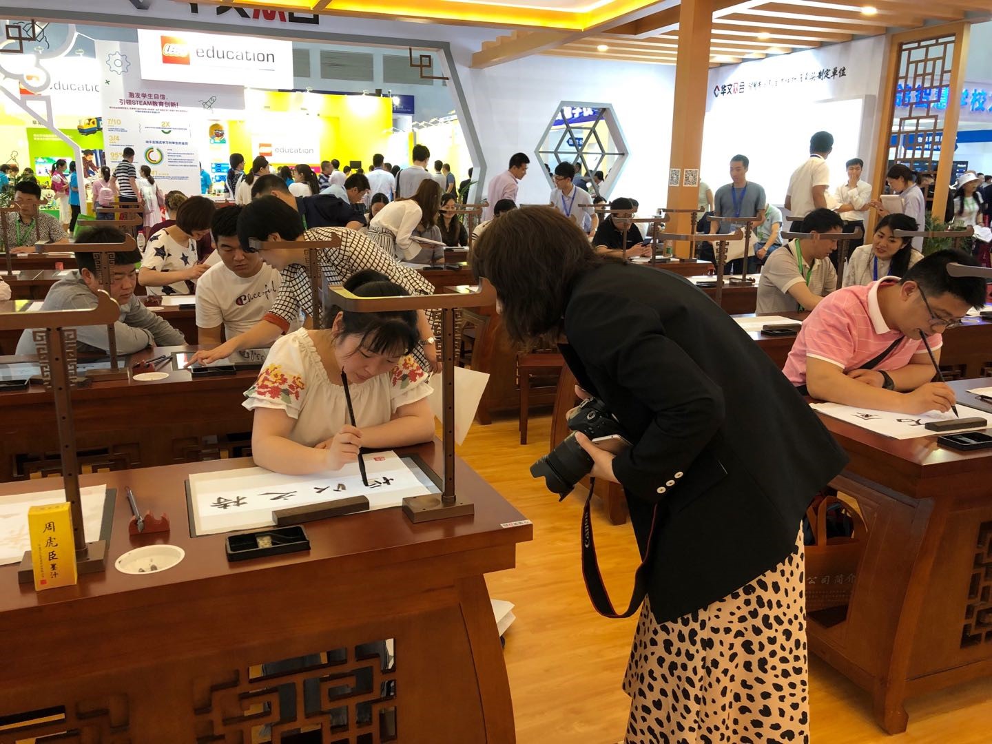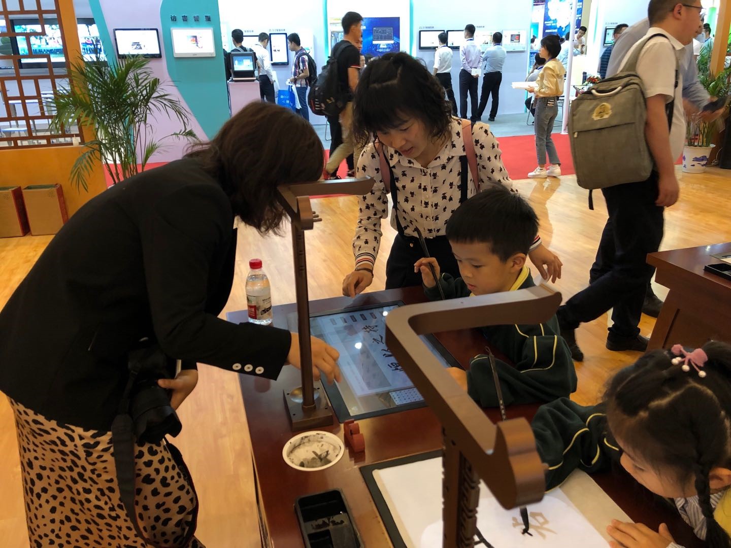 由家長陪同從武漢過來參加展會的兩位小學生,剛剛上一年級,小小的手生澀地握著毛筆,充滿興趣、認認真真,整整寫了一個上午,小朋友們說學校里也開了毛筆課,老師在電腦上講他們在本子上寫,沒有這個好玩沒有這個好寫。