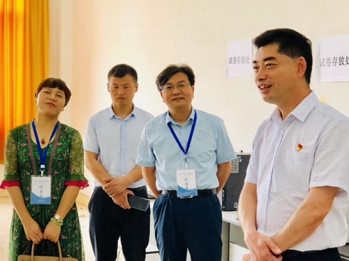 省委教育工委委員、省教育廳總督學曹伴好(右一)現場巡視指導測評工作