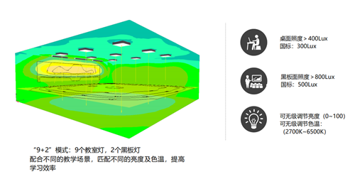 數(shù)言信息智慧光環(huán)境系統(tǒng)支持自由調(diào)節(jié)亮度和色溫,聯(lián)動(dòng)預(yù)設(shè)的10種教學(xué)場(chǎng)景模式,可供自由切換;高透的LED優(yōu)質(zhì)光源,光線柔和不刺眼,照度均勻,無(wú)暗區(qū);>90顯色性,還原物體真實(shí)的色彩;并且所使用的燈無(wú)藍(lán)光、無(wú)眩光、無(wú)頻閃,能更有效的保護(hù)眼睛,預(yù)防近視。