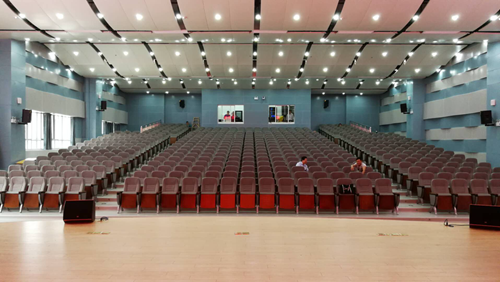 該校多用途禮堂的主揚(yáng)聲器采用的是1000W雙15寸兩分頻音箱,搭配輔助音箱(無源超低頻、環(huán)繞補(bǔ)聲、返聽、臺唇)再匹配適宜功率功放及專業(yè)周邊處理器,合理的選型、布局,保障禮堂廳內(nèi)各處都有足夠的聲壓,較高的傳聲增益,且聲場分布均勻、聲像一致性好、語言清晰度高、無噪聲干擾和音質(zhì)缺陷,滿足各類會議擴(kuò)聲、教學(xué)培訓(xùn)、學(xué)術(shù)報告、校園小型演出、影音播放等多變多用途功能的場景下,都有著優(yōu)秀的表現(xiàn)效果。中央控制系統(tǒng)的加入,能夠?qū)ο到y(tǒng)設(shè)備和周邊設(shè)備隨不同的場景環(huán)境靈活控制與切換。