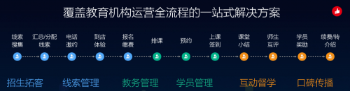 除了招生獲客,有贊教育還覆蓋了教育機構的全流程:從線索收集、線索分配、電話邀約,到報名繳費、排課、預約、上課簽到,再到課堂小結、師生互評、學員獎勵、續費,都將被納入有贊教育的精細化管理體系中。