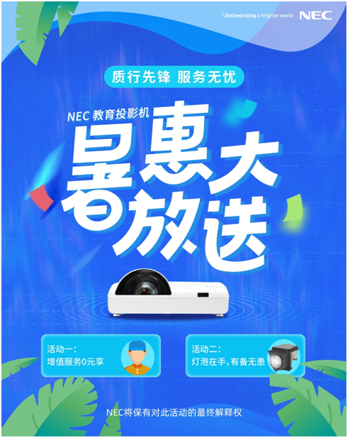 NEC以最火熱的心,全力放“惠”,免費增值服務與免費送燈服務,兩項福利,同期推出,打造NEC教育投影機暑期服務雙連環,為你帶來最足,最貼心,最實用的投影機福利!小編溫馨提示,如此福利,千萬不可錯過~