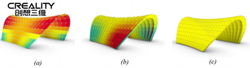 模塊生成:(a)初始曲面細(xì)分為雙曲面四邊形,顏色表示雙曲率;(b)平面化四邊形網(wǎng)格,帶雙曲面,提供結(jié)構(gòu)深度;(c)平面化四邊形網(wǎng)格,帶平面空間結(jié)構(gòu),單列Ur表示平面度。