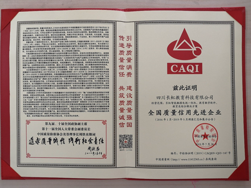 近日,在由國家質檢總局、中宣部、發改委、教育部、科技部、工業和信息化部、環境保護部等47個相關部門聯合行業協會共同主辦的2019年全國質量月活動,長虹教育科技憑借過硬的產品品質、誠信的企業經營再次榮獲“全國質量信用先進企業”殊榮。這是長虹教育科技連續第九年榮獲此項榮譽。