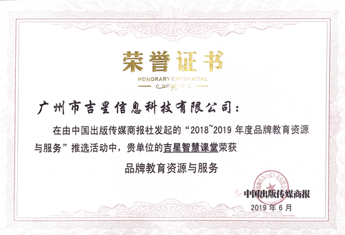 由中國出版傳媒商報社發起的“2018~2019年度品牌教育資源與服務”推選活動中,吉星智慧課堂榮獲“品牌教育資源與服務”榮譽稱號。