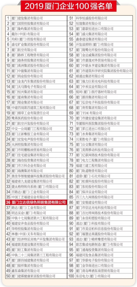 照明行業首位!立達信榮耀登榜“2019廈門企業100強”!