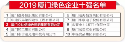 100家企業從廈門幾十萬家企業中脫穎而出,榮耀登榜。立達信在100強榜單中排名第36位,位列照明行業首位,并入選2019廈門綠色企業十強榜單。