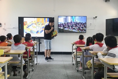 來自暨陽小學的丁圓偉老師帶著精彩的繪本故事來到諸暨市同山鎮(zhèn)達材完小,與暨陽小學的孩子隔空對話,同學一本書,兩校師生進行實時互動。同步課堂讓山里的孩子和城里的孩子一起享受科技帶給教學的新活力。