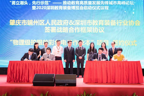 簽約儀式上,在肇慶市端州區區委書記劉慶良,肇慶市端州區區委常委、常務副區長李健暉,肇慶市端州區區政協副主席李沁,肇慶市端州區區政協副主席、區教育局局長吳秀枝,深圳市教育局局長助理、心里程控股集團董事長彭國遠,深圳市教育裝備行業協會理事長朱景鵬,深圳市教育裝備行業協會秘書長羅帝清,深圳市教育裝備行業協會常務副秘書長文熠等領導的共同見證下,深圳市教育裝備行業協會會長彭錦環與肇慶市端州區副區長黎曉簽署了戰略合作框架協議,協會常務副會長單位深圳市前海前沿科技產業管理有限公司總經理吳政銘與深圳市前海謙潤資產管理有限公司首席運營官劉小兵簽署了“物理級護眼的彩色電子作業本”項目協議。