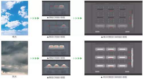 三雄極光智慧學校整體解決方案的人性化還不止這些。在智能教室改造基礎上配套光敏傳感器,當外界入射光線變強時,教室燈將自動降低亮度,充分考慮節能的同時,也使得課桌面照度恒定在國家標準要求的300lx以上。當遇上陰雨天氣,它能監測學生桌面的照度,如低于300lx就會控制教室燈具慢慢開啟,并調整教室燈具的亮度,使學生桌面照度恢復到300lx以上。這就是恒照度照明系統,比現有常規照明方案平均節能4.5W/㎡,值得推廣普及。