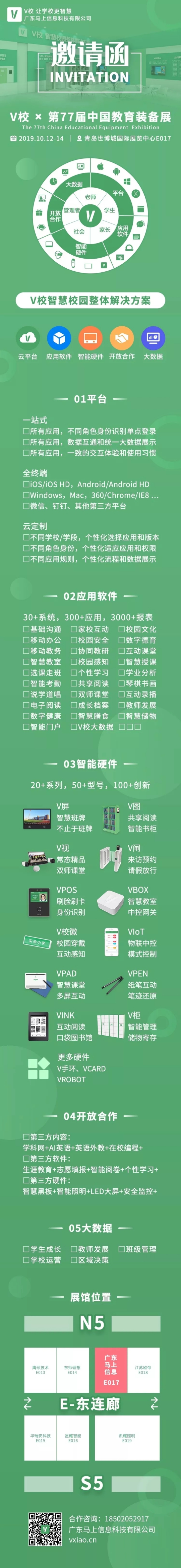時間:2019年10月12-14日展位號:E017地址:青島世博城國際博覽中心(山東省青島市西海岸新區三沙路3399號青島世博城國際展覽中心)屆時,V校將攜智慧校園整體解決方案參與展會,在此誠摯邀請各位嘉賓的到來!