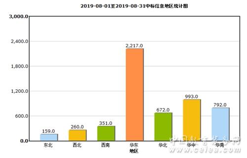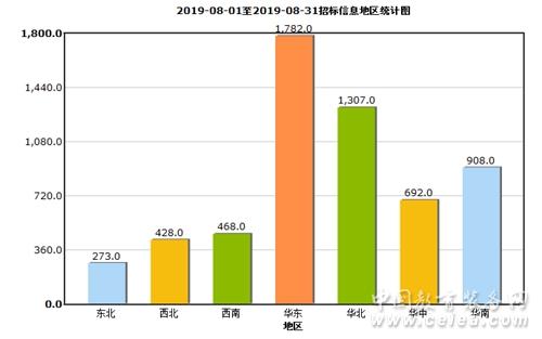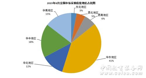 從8月中標信息地區統計圖(如圖8所示)和全國中標信息地區占比圖(如圖9所示)來看:華東地區中標信息量為2217條,占比41%;華中地區中標信息量為993條,占比18%;華南地區中標信息量為792條,占比15%;華北地區中標信息量為672條,占比12%;西南地區招中標信息量為351條,占比6%;西北地區中標信息量為260條,占比5%;東北地區中標信息量為159條,占比3%。