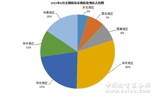 從8月招標采購信息地區統計圖(如圖3所示)和全國招標采購信息量地區占比圖(如圖4所示)可以看出:華東地區招標采購信息量為1782條,占比30%;華北地區招標采購信息量為1307條,占比22%;華南地區招標信息采購量為908條,占比16%;華中地區招標采購信息量為692條,占比12%;西南地區招標采購信息量為468條,占比8%;西北地區招標采購信息量為428條,占比7%;東北地區招標采購信息量為273條,占比5%。