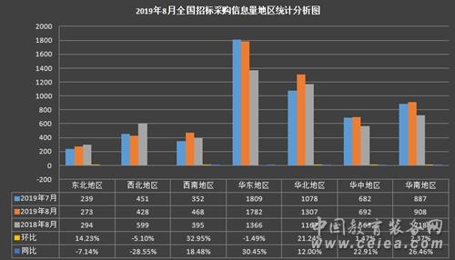 綜合8月全國招標采購信息量地區統計分析圖(如圖5所示):西北地區環比下降5.10%,同比下降28.55%;華東地區環比下降1.49%,同比增長30.45%;華南地區環比增長2.37%,同比增長26.46%;華北地區環比增長21.24%,同比增長12.00%;華中地區環比增長1.47%,同比增長22.91%;東北地區環比增長14.23%,同比下降7.14%;西南地區環比增長32.95%,同比增長18.48%。