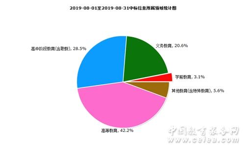 8月中標信息所屬領域統計圖,如圖10所示:學前教育占比為3.1%;義務教育占比為20.6%;高中階段教育(含職教)占比為28.5%;高等教育占比為42.2%;其他教育(含特殊教育)占比為5.6%。