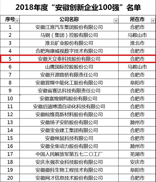 2018年度“安徽創(chuàng)新企業(yè)100強(qiáng)”榜單公布:天立泰科技登榜單前五!