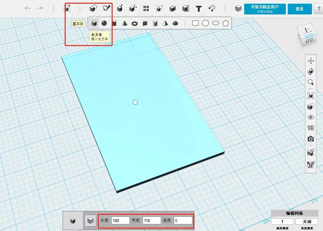 第一步:繪制底座,點擊長方體命令,輸入尺寸:長180mm,寬110mm,高5mm。擺放在任意位置。