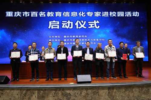 市教育技裝中心黨總支書記姚友明宣讀了《重慶市教育委員會關于公布百名教育信息化專家進校園活動結對專家和學校名單的通知》.隨后,與會領導為專家代表頒發(fā)聘書。