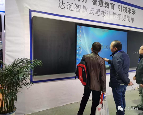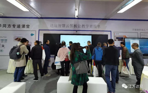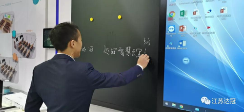 在達冠教育展位聚集了眾多來賓,大家紛紛上前體驗產品,多人同時書寫,一邊書寫一邊擦除,都可以輕松實現,智慧云黑板觸控模組具有自動感應識別功能,消除感應遲鈍狀態,達到與手機同等靈敏度效果,即使黑板表面有大量積水仍可正常觸控。