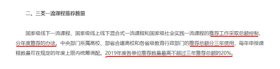 緊接著教育部又發布了《教育部辦公廳關于開展2019年線下、線上線下混合式、社會實踐國家級一流本科課程認定工作的通知》(以下簡稱《通知》),至此金課申報工作正式啟動。通知規定此次三大金課申報工作采用三年限額的方式,也就是2019、2020、2021年三年的限額統一發布,其中2019年申報總數不超過限額的20%,已經運行滿2輪(2學期)的課程可以先行申報,未運行滿2輪(2學期)的課程可以明年或后年再申報。