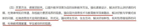 最后,希望教師們能夠積極探索課堂教學模式創新,強化現代信息技術與教育的深度融合,加強課堂互動,探索教育新形態如“項目制教學”、“混合式教學”等,改變以往教師滿堂灌、學生被動聽的現象。