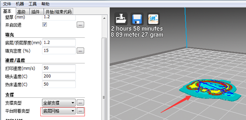 3.在切片軟件的平臺依從性類型上選擇基礎網格,然后在打印模型時會有一個基礎,這有助于模型更好地依附于平臺,并且不會影響模型。
