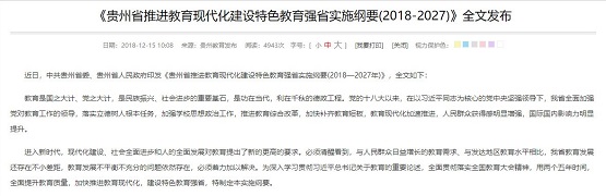 此前,貴州省教育廳發布了《貴州省推進教育現代化建設特色教育強省實施綱要(2018—2027年)》(以下簡稱《綱要》),《綱要》提出了推進學區化、集團化辦學,即縣級政府要制定實施方案,開展多種形式的聯合體辦學實踐,實現資源共享、教師互動、捆綁考核。采取城鎮學校托管農村學校、強校+弱校等方式,鼓勵城鎮優質學校與農村薄弱學校結成校際聯盟,全面提升薄弱學校管理水平和教育教學水平。