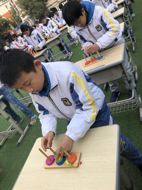 兩節(jié)課后,九江小學的孩子們帶來了精彩的益智器具展示,展示項目包括杯子操、華容道、九連環(huán)、魔方、漢諾塔等,一個個益智器具在孩子們手上大放異彩,形成一道靚麗的風景。在這里,沒有枯燥的公式,也沒有難解的習題,而是通過“玩”這種最簡單的方式,帶領學生進行思維訓練。在充滿游戲樂趣和緊張思維碰撞的精神活動中挑戰(zhàn)固有的思維定勢,開發(fā)學生的智慧潛能。