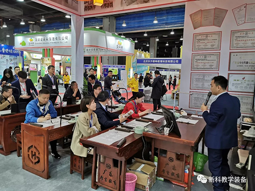 這一次盛大的教育裝備展覽會中,新科教育裝備(簡稱“新科”)也攜帶了自主研發的教育裝備進駐展會,包括智慧書法教室、智慧頂裝實驗室及理化生實驗操作考評系統、新型材料的實驗室桌椅等產品。在現場,有不少教育行業專家、商家上前咨詢及多家媒體前來采訪報道,為“新科”展位累積了不少人氣。
