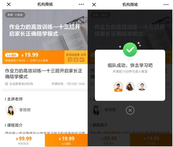 教培機構(gòu)的流量來源受制于管理者的人脈,信鴿機構(gòu)版打造一系列營銷工具為管理者提供了更多選擇。如“組隊聽好課”功能,吸引潛在用戶帶動身邊的流量資源一起試聽,激活每一個用戶的私域流量池,很好地讓流量產(chǎn)生裂變效應(yīng)。