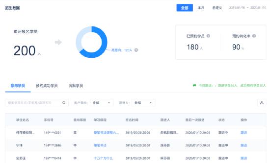 對于管理者來說,流量需要轉(zhuǎn)化。招生管理系統(tǒng)專為管理者篩選高潛用戶,提煉優(yōu)質(zhì)商機。系統(tǒng)無需用戶提交報名,查看課程即可獲取商機,記錄課程行為軌跡,對客戶進行分類,管理者提供精細化運營。