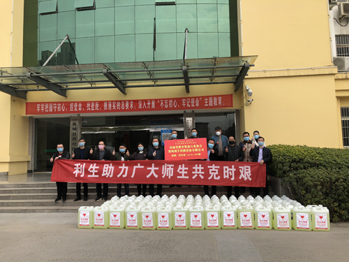 協會常務理事單位開封光大向開封市教體局捐贈洗手液1000kg,向息縣教體局捐贈75%酒精消毒液500kg, 向淮濱縣教體局捐贈75%酒精消毒液500kg。