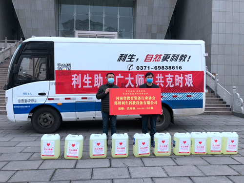 協會副會長單位鄭州利生科教設備有限公司在做好企業自身疫情防控的同時,積極與慈善部門聯系,第一時間向慈善部門捐贈現金15萬元,并多方籌措了數十噸價值六十余萬元的84消毒液、紅外測溫計,酒精等物資,準備專車專人,疫情期間行程幾千公里,捐贈給鄭州市教育局、洛陽市教育局、開封市教育局、鶴壁市教育局、三門峽市教育局、金水區教育局、新密市教育體育局、新密市人力資源和社會保障局、洛陽市老城區教育體育局、洛陽市洛龍區教育體育局、許昌市魏都區教育體育局、襄縣教育局、禹州教育局、鄭州市二七區教育局、湯陰縣教育局、安陽市教育局、漯河市源匯區教育局、南陽市教育局等單位。目前,還有多個地市的教育系統正在積極對接中。
