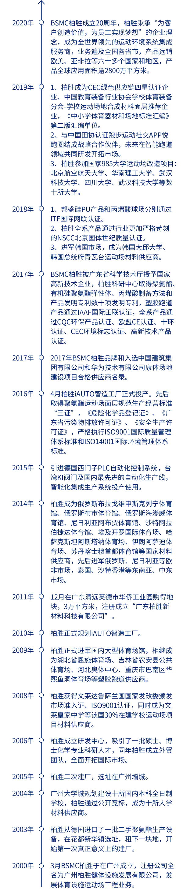 2016年毒跑道事件,行業內沉寂一片時,柏勝接下位于廣州市CBD中心的天河中學跑道場地鋪設項目,并且同年全面開拓國際市場,這在當時是絕無僅有的。