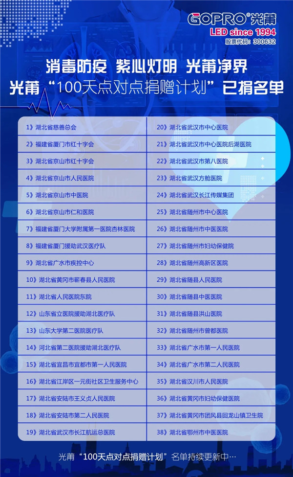光莆股份“100天點對點捐贈計劃”實施以來,積極對接疫區(qū)防疫指揮部和醫(yī)院收集信息,確保愛心援助物資第一時間到達疫區(qū)一線。目前,光莆紫外系列殺菌消毒產(chǎn)品已在湖北及福建疫情防治定點醫(yī)院、疫情隔離觀察酒店等多處投入使用,為“最美逆行者”保駕護航。
