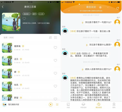 當(dāng)讀詩和對詩不成問題時(shí),阿爾法蛋會(huì)引導(dǎo)孩子們逐漸了解詩詞的含義,比如孩子問:"'浮云游子意'是什么意思?""《送友人》這首詩的含義。""《送友人》的作者是誰?"……阿爾法蛋都會(huì)耐心地為小朋友們講解。能夠熟讀、又能了解含義,孩子們對古詩的興趣越來越高,背起古詩來也容易許多。這個(gè)時(shí)候,不用多費(fèi)功夫,孩子就已經(jīng)能夠倒背如流啦。
