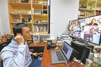疫情期間,清華大學(xué)新聞與傳播學(xué)院副教授梁君健在辦公室進(jìn)行遠(yuǎn)程授課,講授攝影課程。鄧偉 攝