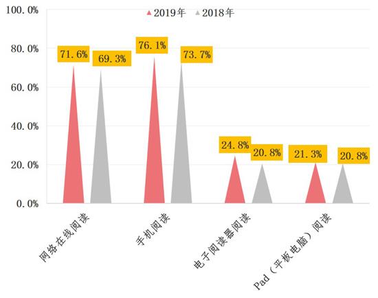 具體來看,2019年有76.1%的成年國民進行過手機閱讀,71.6%的成年國民進行過網絡在線閱讀,24.8%的成年國民在電子閱讀器上閱讀,21.3%的成年國民使用Pad(平板電腦)進行數字化閱讀,均較2018年有所上升。
